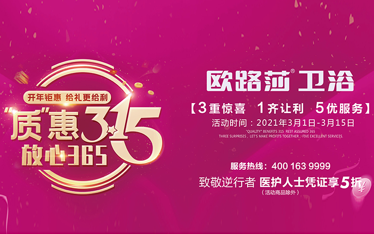 “質(zhì)”惠315 放心365 | 歐路莎衛(wèi)浴開年大促火熱開啟!3月1日-3月15日,歐路莎衛(wèi)浴開年第一戰(zhàn),我們嚴陣以待,火力全開,做到讓消費者花最少的錢,買最好的東西!MORE -