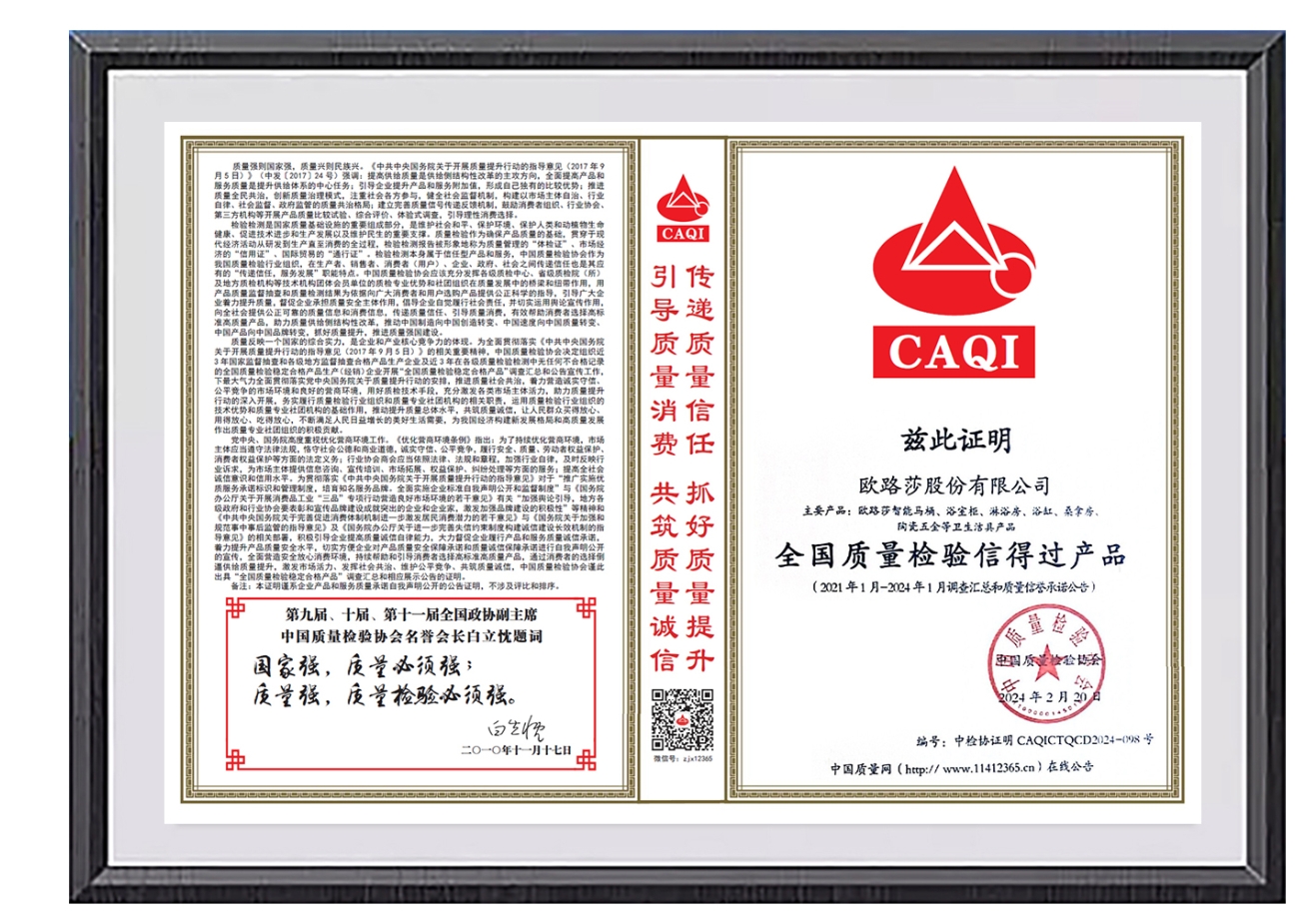 質量,是一個企業的生存之本,也是一個國家的強國之基。歐路莎專注高端智能健康衛浴26年,始終堅持“誠信為先,質量為本”的經營理念,堅守品質,不斷完善質量管理體系、履行企業質量責任,打造民族質量品牌,推動質量強國建設,在質量變革的大潮中,為新時代高質量發展做出積極的貢獻。