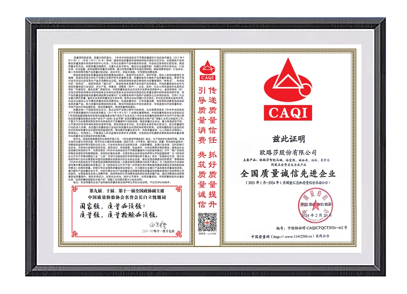 中國質量檢驗協會作為國家市場監督管理總局直屬的全國產品質量監督檢驗領域唯一國家級質量專業機構,已連續20余年開展“產品和服務質量誠信承諾”主題活動,此次榮譽的獲得是國家質量部門對歐路莎品牌形象、產品品質、服務口碑的高度認可。
