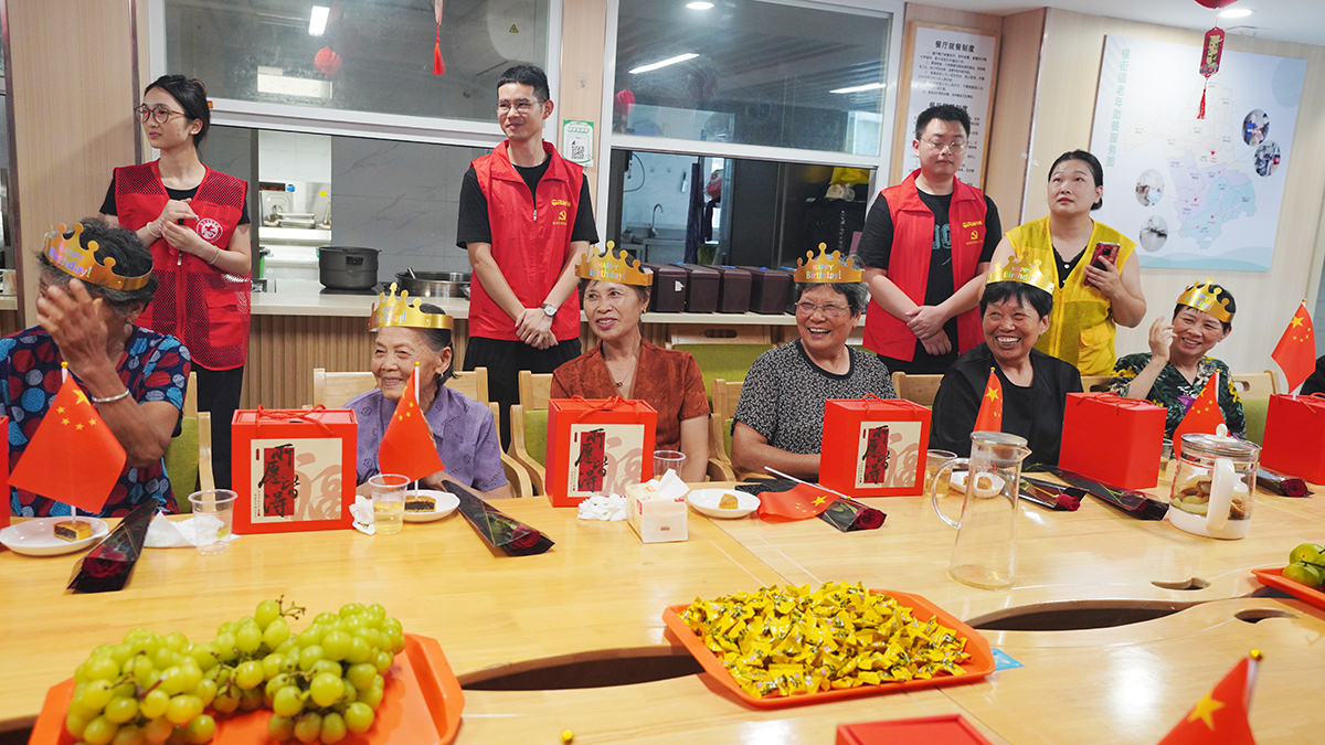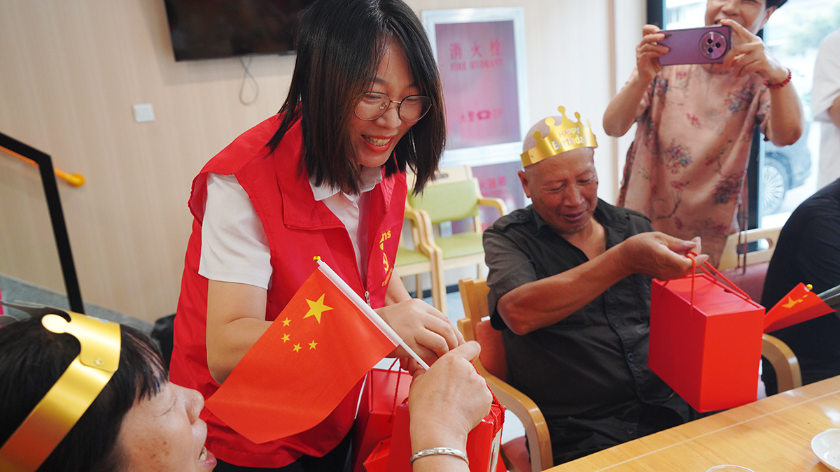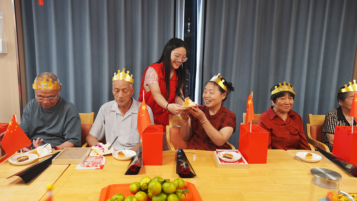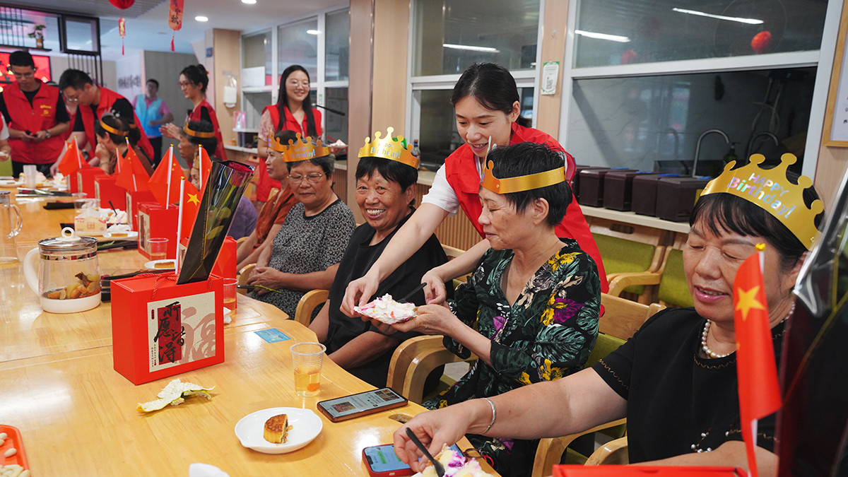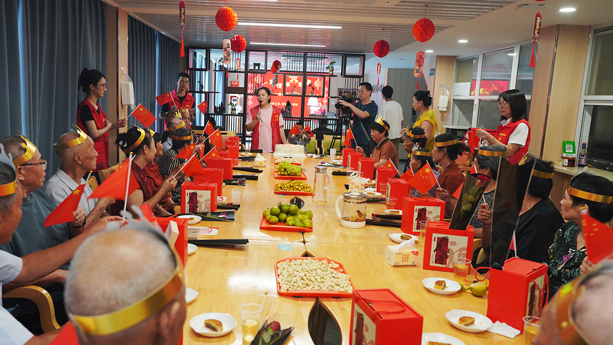 憶當(dāng)年,享盛世。現(xiàn)場(chǎng)笑聲此起彼伏,歌聲嘹亮,老人們一起跟著志愿者唱響“歌唱祖國(guó)”,提前與偉大祖國(guó)一起共慶“生日”時(shí)光;老人們和志愿者們分享著自己年輕時(shí)的故事,品嘗著零食、蛋糕……仿佛倒流回年輕時(shí)光。