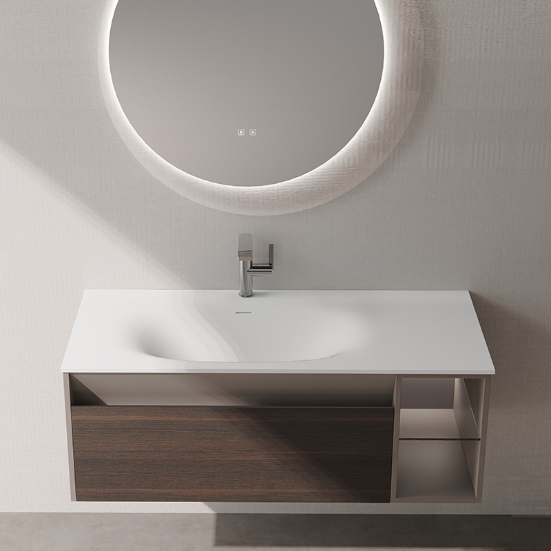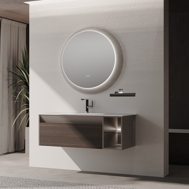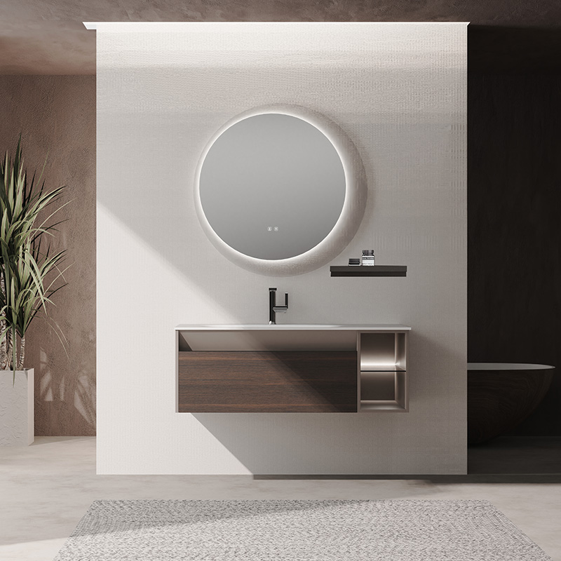 材質:奇美石一體盆/煙熏橡木/智能圓鏡/置物架可選配/品質實木