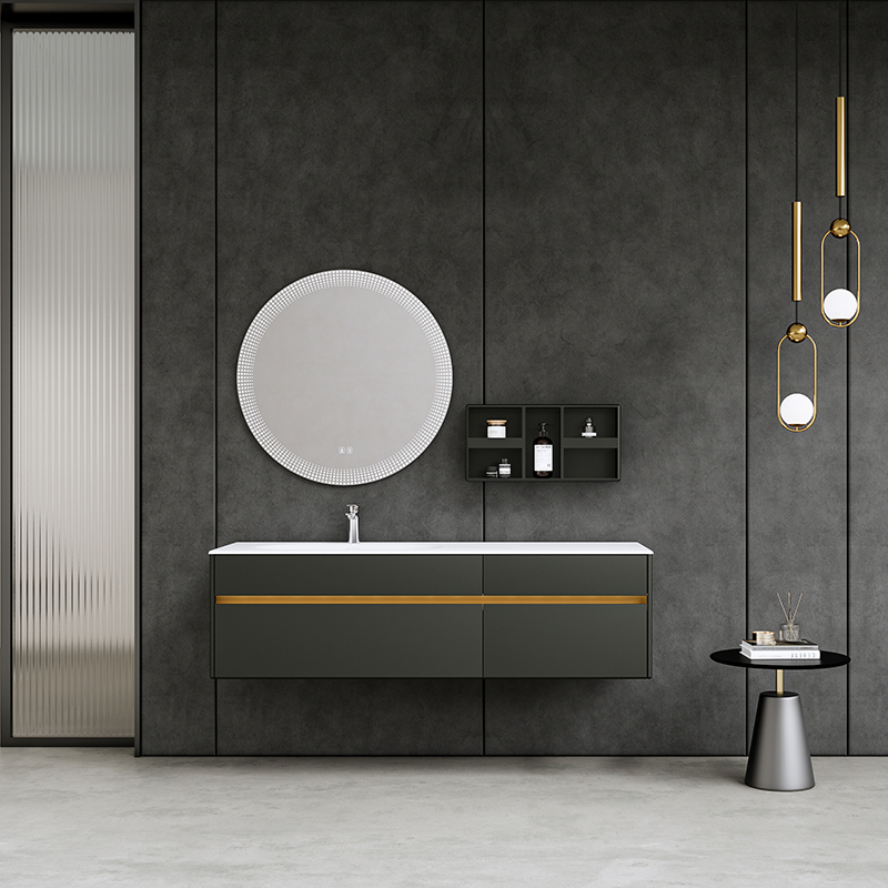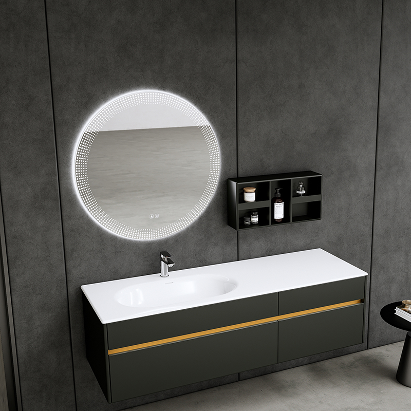 材質:白色可麗耐一體盆/銀煙霧柜體/智能鏡/多層實木
