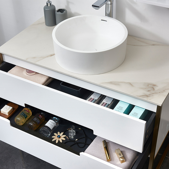 實(shí)木多層板,層層精工,防水防潮;304不銹鋼柜腳,防腐防銹;巖板臺(tái)面,優(yōu)質(zhì)亞克力臺(tái)上盆,易潔美觀;靜音液壓滑道,輕松緩沖。
